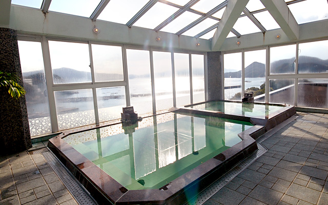 ガラスをはりめぐらした明るく自然と一体となった大浴場。広く太平洋、鳥羽湾が一望のもと手足を伸ばしてゆったりとお楽しみ下さい。水平線に昇る朝日、又美しい夕陽、そして漁火に満天の星空と刻々と色を変える窓辺の風景が心を和ませます。